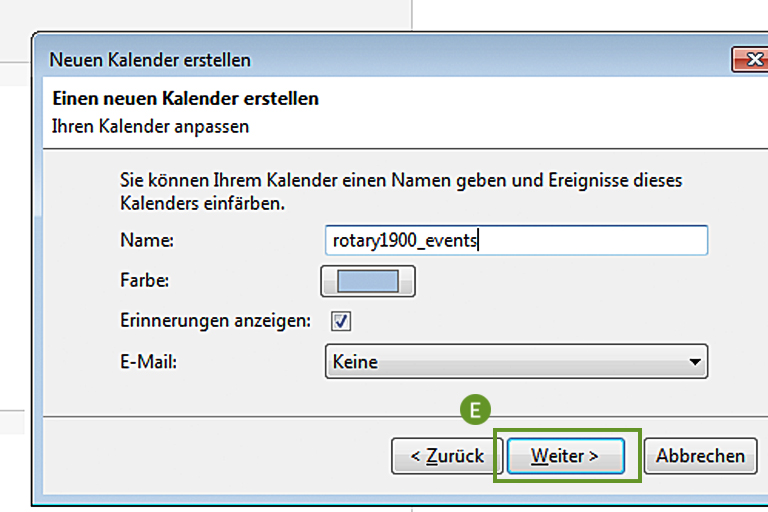 Der Name des Kalenders wird automatisch vorausgefüllt. Klicken Sie auf Weiter und dann auf Fertigstellen